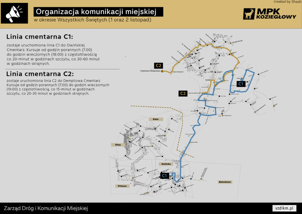 informujemy, że w dniach 1 oraz 2 listopada 2025 r. nastąpią zmiany w funkcjonowaniu komunikacji miejskiej w Koziegłowach w związku z obchodami Uroczystości Wszystkich Świętych.