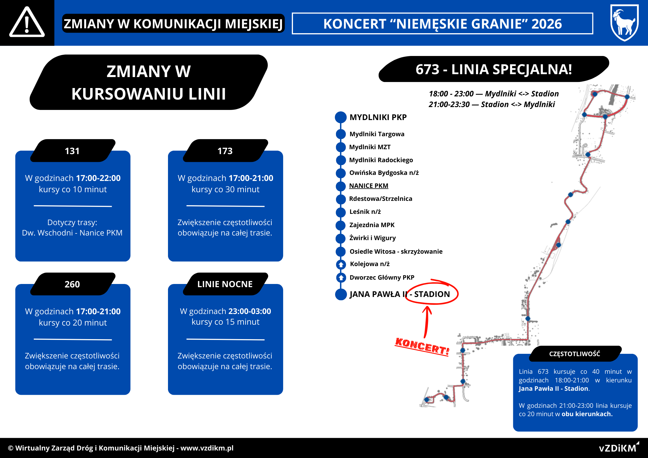 - uruchomiona zostanie specjalna linia 673 na trasie Owińska Mydlniki Stacja PKP – Nanice PKM – Jana Pawła II Stadion, kursująca w godzinach 18:00 – 21:00, z częstotliwością co 40 minut w kierunku Jana Pawła II Stadion oraz 21:00 – 23:00, z częstotliwością co 20 minut w obu kierunkach trasy.